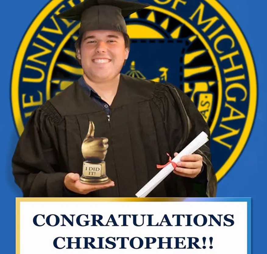 Arnold wrote, “Christopher, you are a champion and I love you. I know your graduation from Michigan wasn’t the big celebration you dreamed about for years, but walking across a stage isn’t what makes me so proud of you: it’s your compassion, your hard work, your vision, your critical thinking, and your selflessness that make me burst with pride. I can’t wait to watch you keep climbing and succeeding.”
