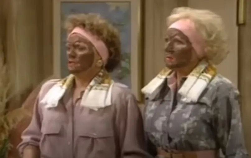 Rose (Betty White) and Blanche (Rue McClanahan) are applying mud facials when Lorraine’s family arrives. They say, “This is mud on our faces, we’re not really black.”