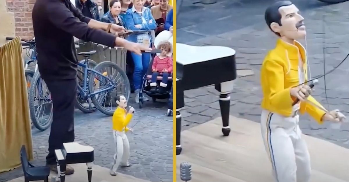 As Queen plays in the background, the man behind the puppet strings causes the puppet to move so gracefully, even its mouth, as it sings so realistically. In the video, people crowd the marionette puppet, taking pictures and videos as they watch in awe.