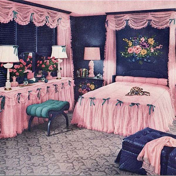 From mirrored and metallic finishes and wallpapers to curved walls and glass bricks accents to the overkill of florals and ruffles, wood paneling galore, shag carpets with shag rugs with shag bathrooms, round showers, Avocado Green and Yellow Harvest kitchens, the very multiple mixes of patterns…the list is endless.